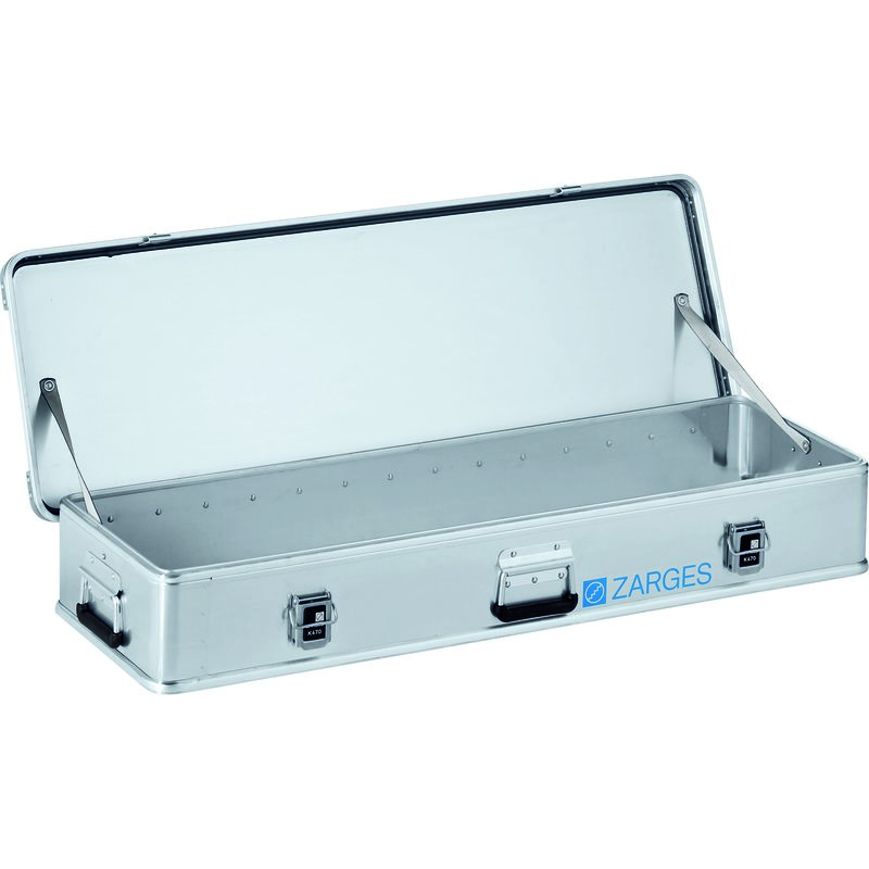 Stapelecken aus Aluminiumguss · Deckel mit durchgehendem Edelstahl-Scharnierband und zwei Gurtbändern · durch geschäumte Deckeldichtung staub- und spritzwassergeschützt · Stabilität durch drei vollverschweißte Aluminiumprofilrahmen und Nietverbindungen durch Vollnieten · hochbelastbare Federfallgriffe · mit Klappverschlüssen 54 mm, Sicherung durch Plomben, Steckschloss oder Vorhängeschloss (max. Bügelstärke 6 mm) - gehört nicht zum Lieferumfang · Weitere technische Eigenschaften Innenhöhe: 670mm · Innenlänge: 1650mm · Innenbreite: 750mm